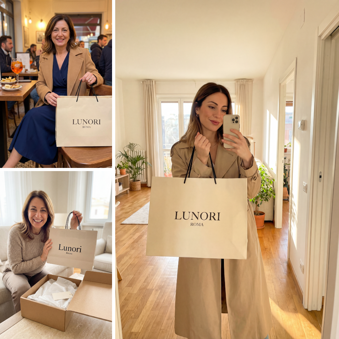Dietro Lunori Roma c’è un team reale, presente e attento. Controlliamo ogni ordine, rispondiamo ai messaggi e ti aiutiamo con taglie e scelte — con la cura di una boutique, non di un call center. Qui sei in buone mani.